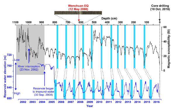 自2009年以来,由中国科学院地球环境研究所、南加州大学、杜伦大学、澳大利亚国立大学和台湾成功大学等科研人员组成的国际研究团队,通过对2008年汶川特大地震产生的滑坡和岷江流域河流悬浮物的长期监测和系统研究发现,龙门山地区长时间尺度上的剥蚀速率和通量主要受控于地震产生的滑坡物质,而滑坡物质搬运出在流域的时间,则不但取决于流域内滑坡数量,还与每年受季风控制的高强度的径流天数紧密相关。为了深入认识气候和构造在沉积过程中的相对作用,该研究团队利用紫坪铺水库沉积序列,进一步开展了2008年汶川地震前后气候和构造对滑坡物质的搬运和沉积过程制约的研究。