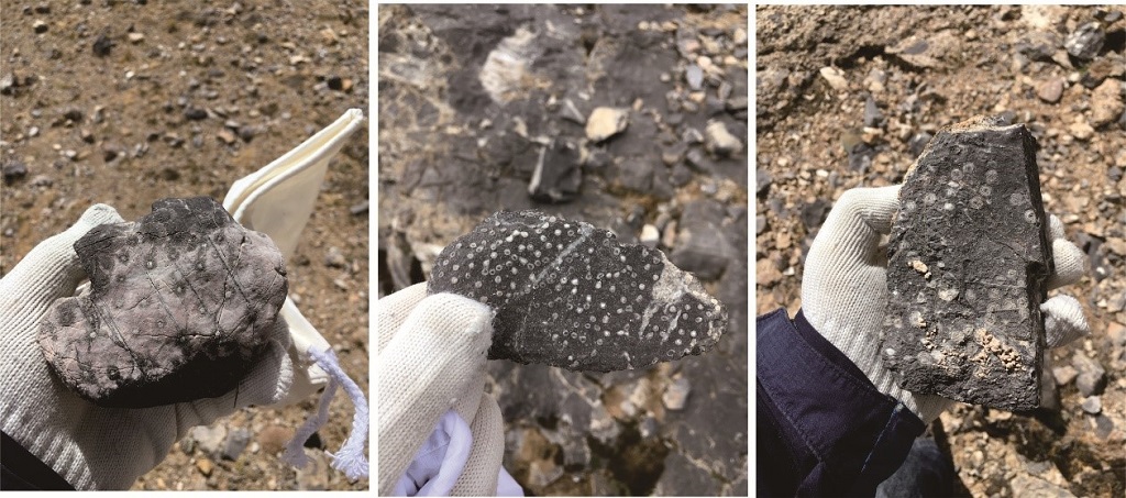 接下来的几天,科考小组持续在扎日南木错北岸和南岸进行了许多剖面的测制。其中在扎日南木错南岸科考时碰到了条较长的剖面,但去了两次也没找到有价值的化石。没有化石就意味着即使测量了剖面,也不知道这条剖面属于什么时代,因此大家心里都很着急。终于在23号,当大家第三次去时无意中在转石上发现了化石的踪迹。于是大家分头行动,终于,功夫不负有心人,最终让我们找到了化石的露头,发现了大量的复体珊瑚、滴管珊瑚和䗴类(图16),通过放大镜观察了这些䗴类化石,确认了它们的时代是属于中二叠世(2.69-2.65亿年前)。找到化石了,确定时代了,大家都特别开心,看到远处空旷壮阔的扎日南木错(图17),心情也感到格外的舒畅与放松。