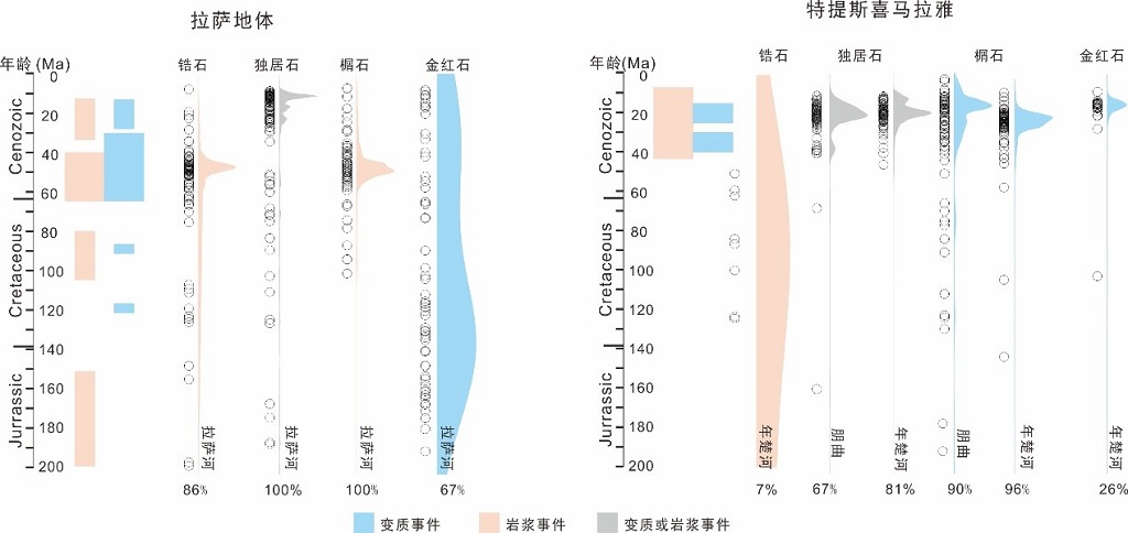 流经喜马拉雅造山带的年楚河与朋曲河流砂中,碎屑锆石无法追溯到该地体发生的岩浆事件(如广泛分布的特提斯喜马拉雅淡色花岗岩),但其碎屑榍石和金红石记录到了同期(44-7 Ma)的变质事件。有此可见,碎屑锆石金红石很少反映年轻的岩浆和变质事件,主要反映了更老的早古生代(>500 Ma)和更老的前寒武纪结晶基底的年龄。