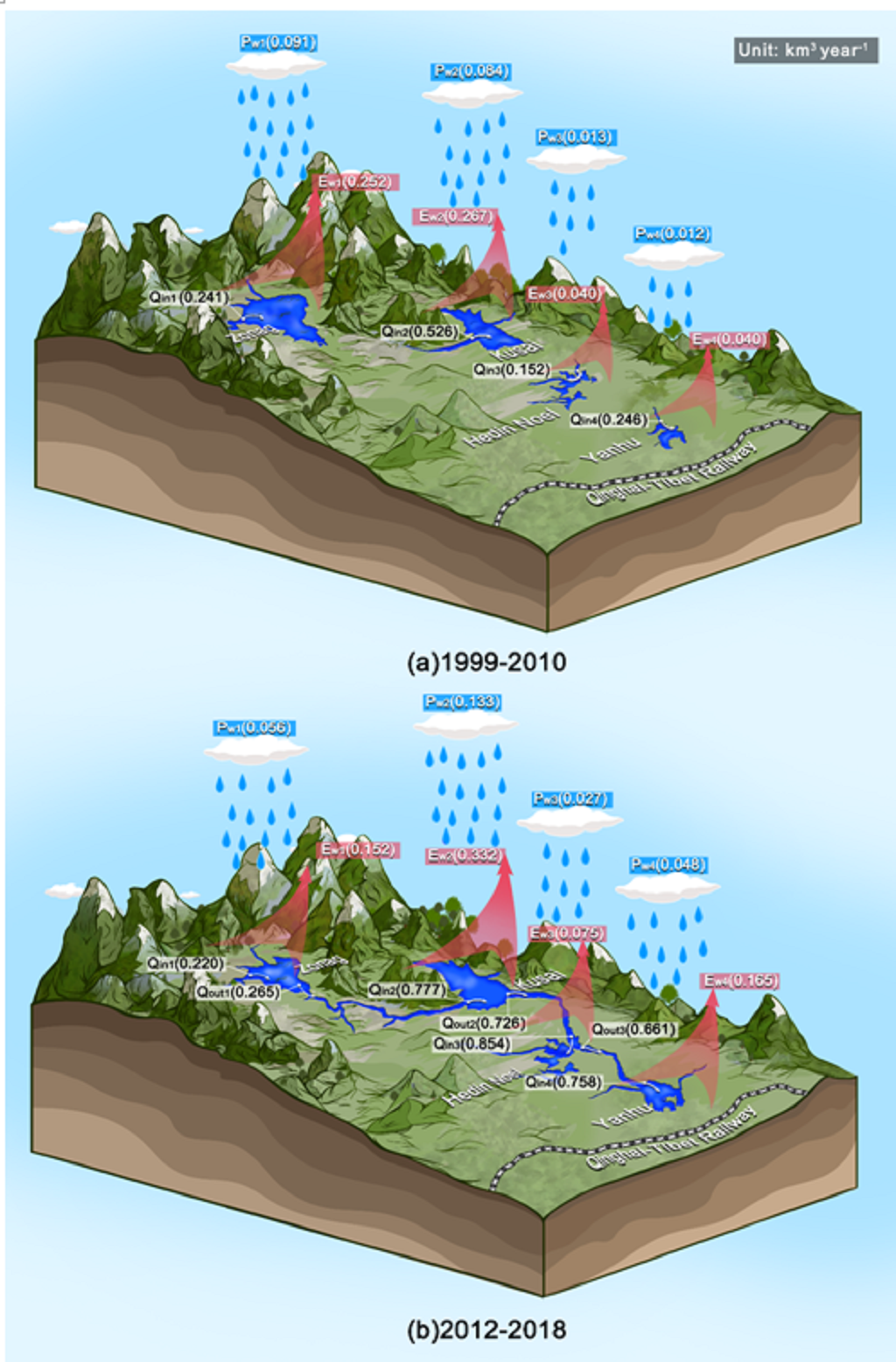 图2可可西里地区串联湖泊流域卓乃湖溃决前(a)后(b)的水量平衡变化