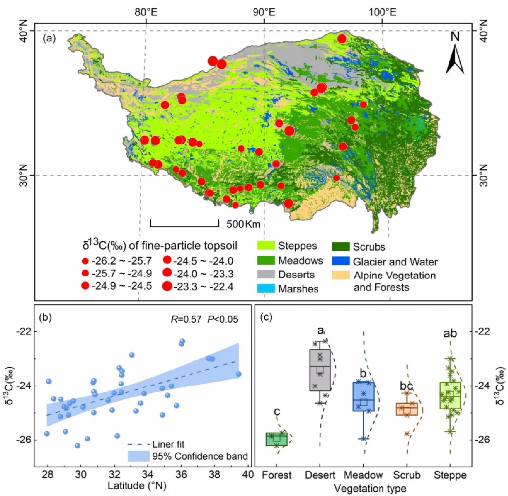 图3. 青藏高原细颗粒表土δ13C值的空间分布